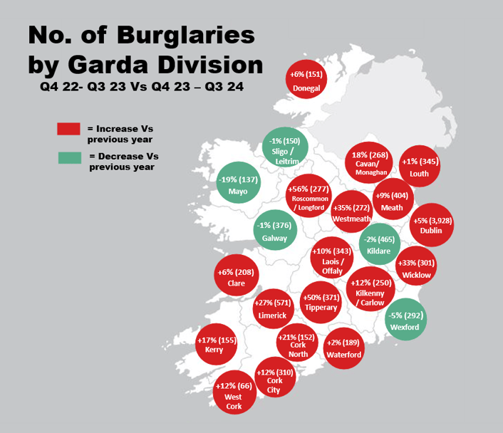 - Roscommon and Longford Gardaí division had a 56% increase in burglaries with 277 burglaries.